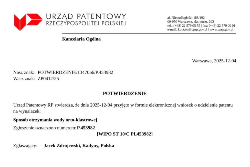 To pierwszy krok, ale niezwykle ważny — bo oficjalnie rozpoczyna erę wody orto-klastrowej jako rozwiązania chronionego prawem wynalazczym.