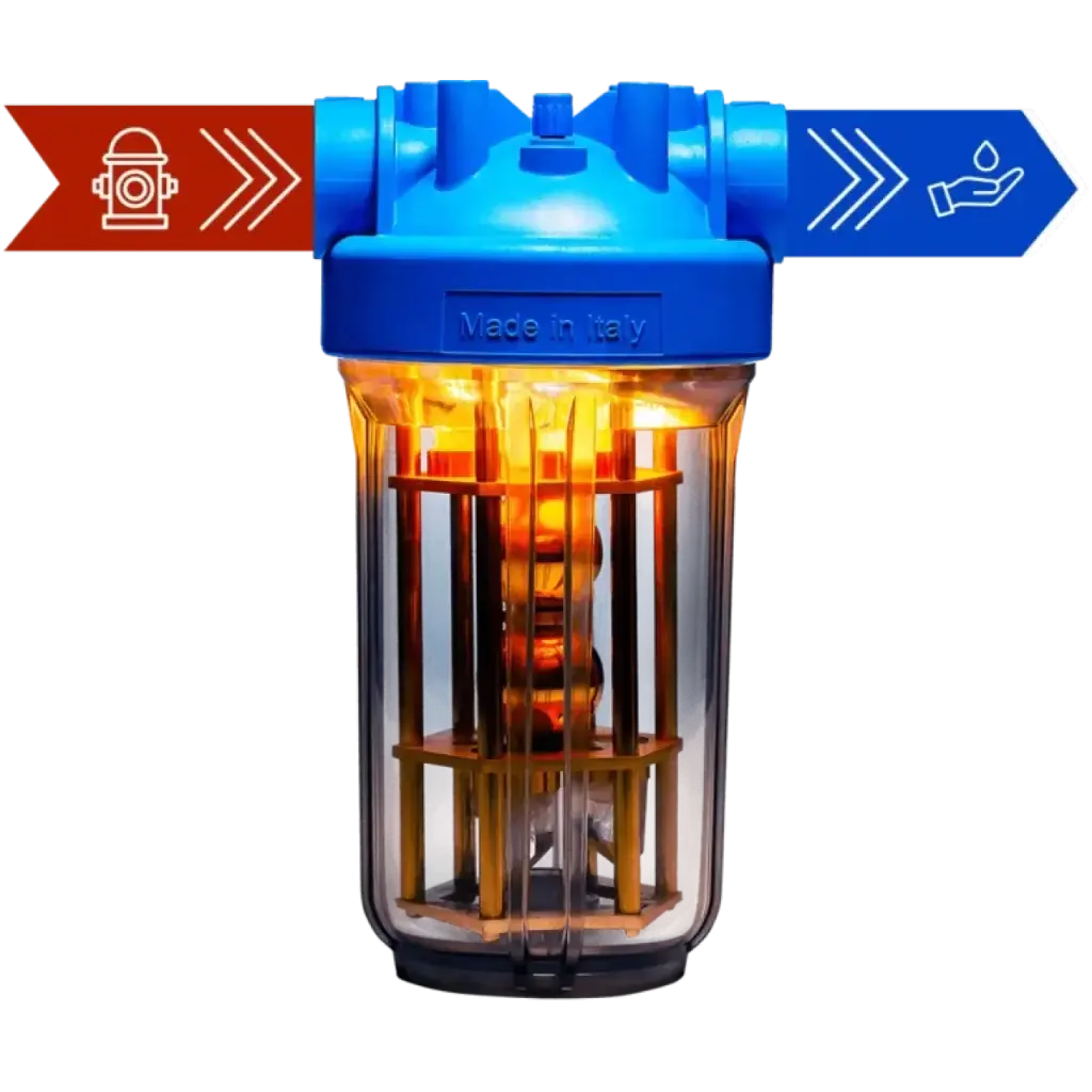 System zaleca się montować na wejściu wody do budynku – tuż za licznikiem, a przed systemem grzewczym. ALIA 105 pasuje do standardowych 10-calowych obudów filtracyjnych.